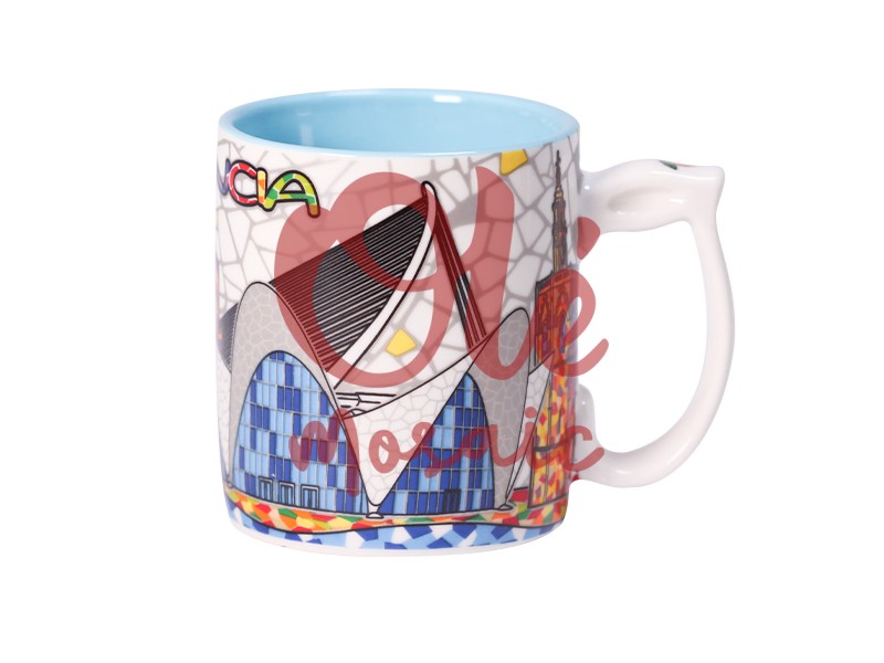 Esta taza de cerámica, de elegante color blanco, es el recuerdo perfecto de la emblemática Ciudad de las Artes y las Ciencias de Valencia. Su diseño vibrante y detallado captura la impresionante arquitectura del complejo, donde se conjugan modernidad y creatividad, convirtiéndolo en un símbolo de la ciudad. Con el interior en un atractivo tono azul, la taza presenta un acabado lleno de mosaicos coloridos que resaltan los contrastes visuales, aportando un toque artístico a cada sorbo.