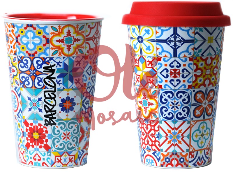 Vaso de cerámica con diseño de mosaico inspirado en la rica herencia cultural de Barcelona. Este atractivo vaso presenta una vibrante colección de patrones geométricos en una mezcla de colores azul, rojo y amarillo, que evocan la azulejería típica de la ciudad. La inscripción «Barcelona» añade un toque distintivo, mientras que su tapa de silicona roja aporta comodidad y funcionalidad. Un souvenir perfecto para disfrutar de tus bebidas con estilo y recordar tu visita a la ciudad.