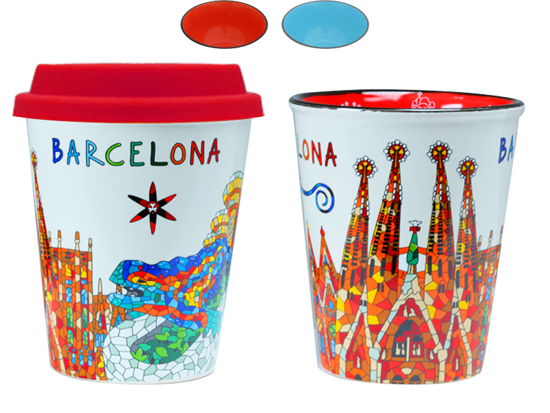 Vaso de cerámica con una vistosa panorámica de Barcelona, diseñado en un alegre tono beige. Este vaso presenta ilustraciones vibrantes del icónico mosaico de Gaudí y la majestuosa Sagrada Familia, acompañadas de la palabra «Barcelona» en letras coloridas. La parte superior está decorada con una tapa roja que le añade un toque atractivo y funcional. Ideal para disfrutar de tus bebidas favoritas mientras recuerdas la belleza de esta ciudad catalana.