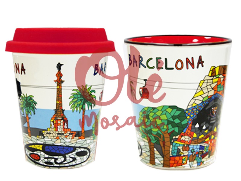 Vaso de cerámica con un diseño panorámico representativo de Barcelona, ideal para disfrutar de tus bebidas favoritas. Este atractivo vaso, de color beige, presenta ilustraciones vibrantes que muestran la emblemática columna de Colón, palmeras y coloridos mosaicos, evocando el famoso Parque Güell. Con un borde rojo y detalles en negro, es una pieza funcional y decorativa que captura la esencia de la ciudad condal, perfecta como recuerdo o para el uso diario.