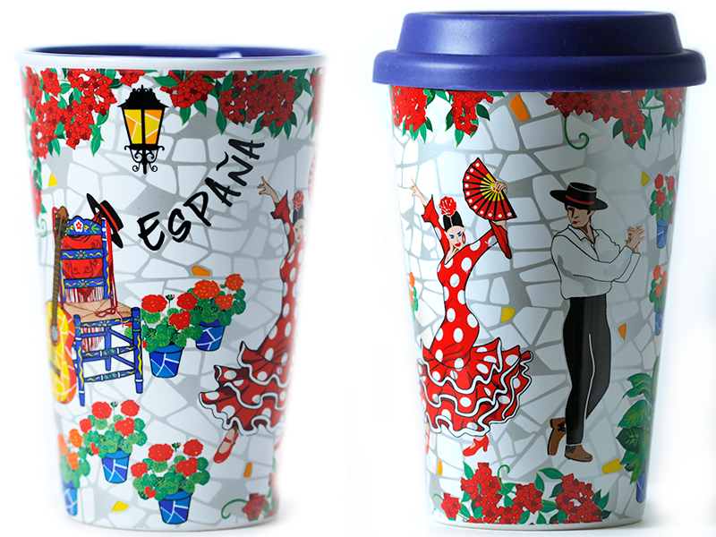 Detalles en azul y un simpático mensaje que dice «España» completan el diseño, haciendo que cada sorbo de tu bebida favorita sea un recordatorio de la rica cultura española. La técnica de pintura a mano no solo añade autenticidad, sino que también resalta el valor artesanal del producto, convirtiéndolo en un recuerdo único que los turistas apreciarán.