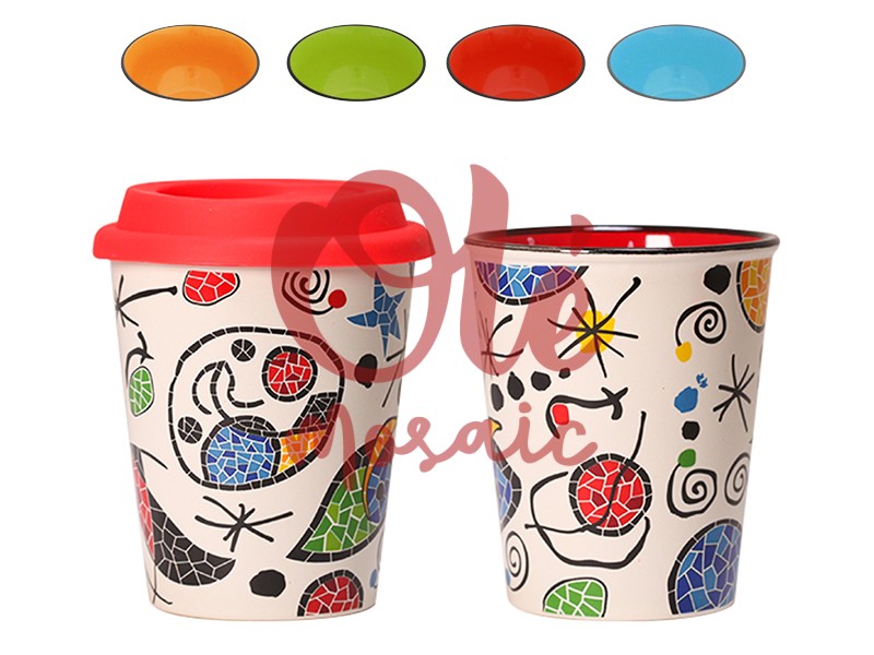 Vaso de cerámica de diseño colorido, inspirado en el famoso estilo artístico de Gaudí, conocido como «Punt de trobada». Este vaso presenta un atractivo patrón de mosaicos en tonos azules, rojos, verdes y amarillos, que evocan la esencia vibrante de la arquitectura modernista de Barcelona. Su tapa de silicona roja añade funcionalidad y un toque moderno, convirtiéndolo en un artículo ideal para disfrutar de bebidas frías o calientes mientras se aprecia un pedazo del arte catalán.