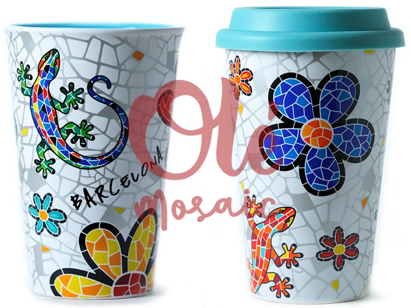 La parte superior del vaso está rematada con una tapa azul, que no solo aporta funcionalidad, sino que también resalta su diseño contemporáneo. Este vaso no es solo un objeto para disfrutar de bebidas; es un auténtico recuerdo de Barcelona que encapsula la mezcla de arte y naturaleza que caracteriza a la ciudad. Perfecto para los turistas que buscan souvenirs auténticos y representativos, este vaso es ideal para cualquier tienda de regalos turísticos que desee ofrecer productos verdaderamente emblemáticos. En Olé Mosaic, como distribuidores de souvenirs de cerámica al por mayor, garantizamos que cada pieza es un reflejo del patrimonio cultural español, lo que convierte este vaso en una opción inigualable para quienes quieren llevarse un pedacito de Barcelona a casa.