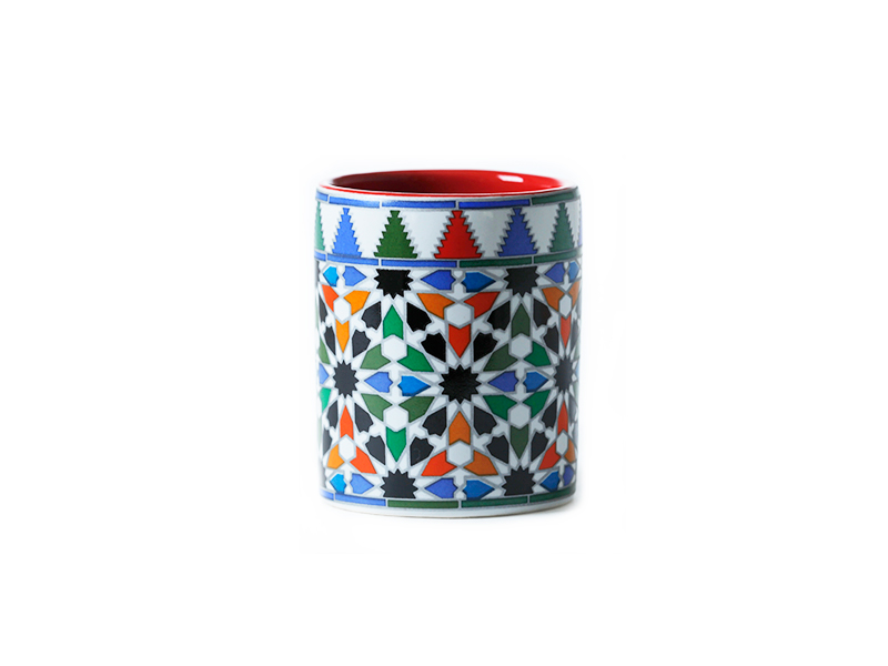 Vaso de chupito de cerámica alicatado con un diseño vibrante en blanco, rojo, verde, azul, negro y naranja. La pieza presenta un intrincado motivo geométrico inspirado en el arte del alicatado, propio de las tradiciones artesanales andaluzas. El interior rojo realza la riqueza cromática del exterior, donde se alternan formas simétricas y coloridas, creando un objeto decorativo y funcional, ideal para disfrutar de un trago en celebraciones y ocasiones especiales.