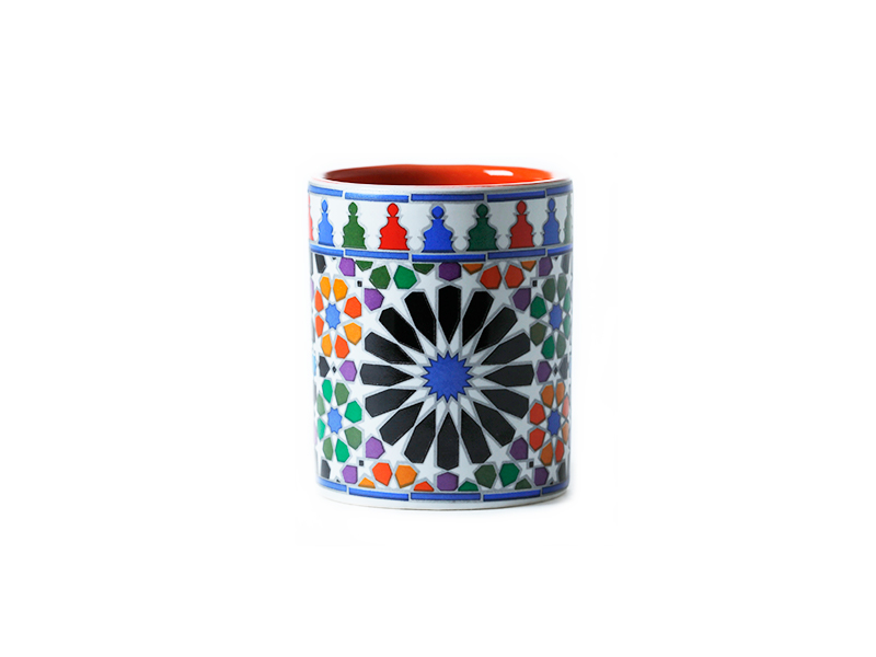 Vaso de chupito de cerámica con diseño de azulejos en tonos vibrantes. Este atractivo vaso presenta un fondo blanco adornado con intrincados patrones geométricos en negro, azul, verde, naranja y rojo, evocando la rica tradición del arte cerámico español. La parte superior del vaso es de un cálido color rojo, que contrasta a la perfección con los elaborados motivos decorativos. Ideal para disfrutar de tus bebidas favoritas, este accesorio es un recuerdo auténtico de la cultura española.