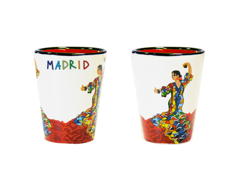 Vaso de chupito de cerámica con la ilustración de una bailaora flamenca, que representa la energía del arte en Madrid. Este atractivo vaso, de color beige, presenta un diseño artesanal, pintado a mano, que muestra a la bailaora en pleno movimiento, rodeada de detalles coloridos que evocan el folclore español. La inscripción «MADRID» destaca en vibrantes colores, añadiendo un toque distintivo a este souvenir que captura la esencia cultural de la capital española.