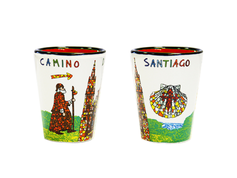 Vaso de chupito de cerámica decorado, relacionado con el Camino de Santiago. Este atractivo vaso beige presenta ilustraciones coloridas que representan al peregrino y la famosa catedral de Santiago, además de la icónica concha del camino. Con detalles pintados a mano y un borde negro, es un souvenir ideal para recordar esta histórica ruta. Perfecto para tomar un chupito o como pieza decorativa.