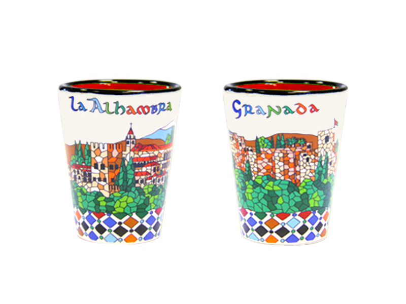 Vaso de chupito de cerámica decorado con ilustraciones de la Alhambra y la ciudad de Granada. Este atractivo vaso en tonos beige presenta un diseño artesanal, pintado a mano, que resalta la majestuosidad del famoso palacio, con detalles de su arquitectura y la vegetación circundante. En los laterales, se puede leer «La Alhambra» y «Granada» en colores vibrantes, complementado con un borde negro y un mosaico en la base, que evocan la rica cultura andaluza. Ideal para recordar tu visita a este emblemático lugar.