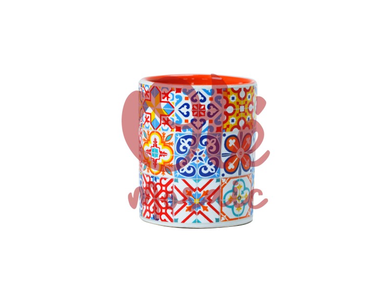 Este vaso de chupito de cerámica, decorado con un vibrante mosaico de colores, captura la esencia del arte cerámico español. Su diseño presenta una serie de patrones geométricos en una paleta de colores cálidos y alegres: naranjas, azules y rojos, que se combinan armoniosamente para ofrecer una representación estilizada de la tradición artesanal de España. El vaso tiene un acabado brillante que resalta los intrincados detalles de cada mosaico, mientras que su interior, de un brillante color rojo, añade un toque de frescura y vitalidad. Esta pieza funcional es ideal para disfrutar de un chupito en celebraciones y reuniones, y también funciona como un atractivo elemento decorativo, aportando un toque de alegría y folclore a cualquier hogar.