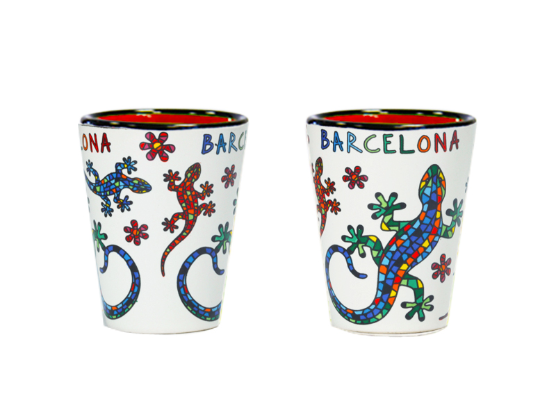 Vaso de chupito de cerámica decorado con salamandras, perfecto para recordar Barcelona. Este atractivo vaso, de color beige, presenta un diseño artesanal, pintado a mano, con elementos coloridos y motivos florales, incluyendo la famosa salamandra de Gaudí, símbolo de la creatividad de la ciudad. Su interior es rojo, aportando un contraste vibrante que realza su belleza artesanal y encanto cultural. Un recuerdo ideal para los amantes de la arquitectura y el arte catalán.