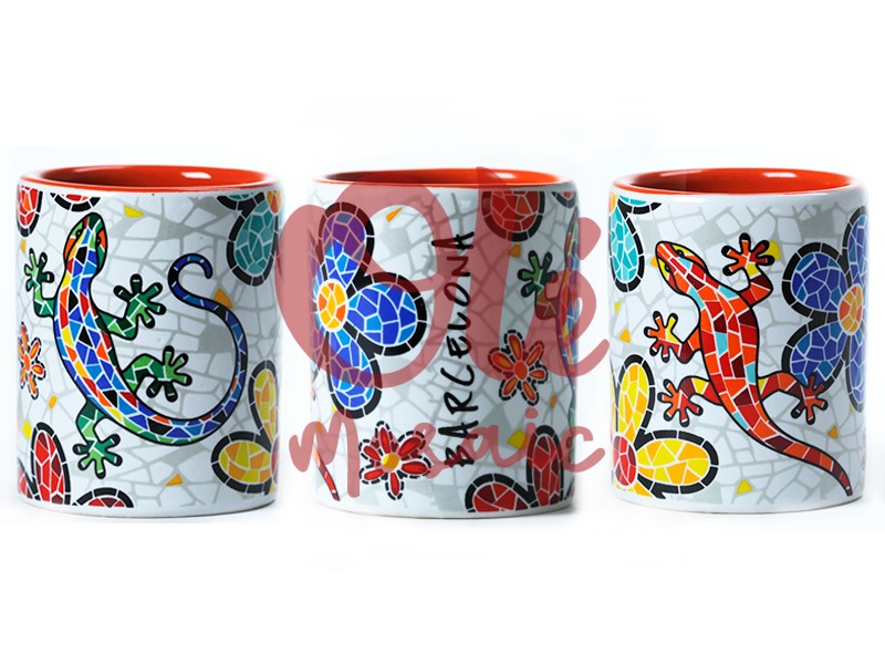 Este vaso de chupito de cerámica, decorado con vibrantes motivos de salamandras y flores, es una auténtica representación de la colorida estética de Barcelona. Con un fondo blanco que realza sus impactantes gráficos, el diseño del vaso está inspirado en el famoso mosaico de Gaudí, mostrando una salamandra en tonos azules y otra en rojo, rodeadas de diversas flores en colores vivos que evocan la alegría y vitalidad de la ciudad. La palabra «Barcelona» aparece de manera artística, integrándose armónicamente con el resto de la decoración, y añadiendo un toque distintivo que certifica su conexión con esta emblemática metrópoli.