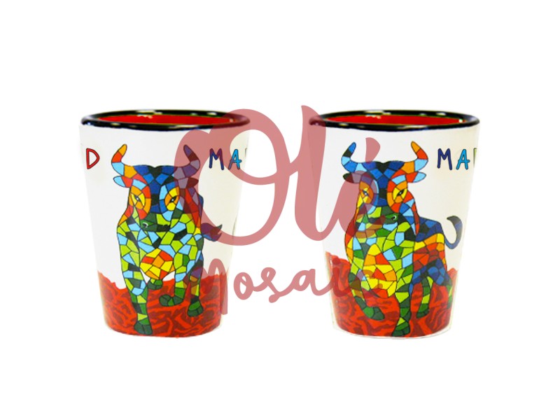 Vaso de chupito de cerámica decorado con un vibrante diseño de toro, emblema de la cultura española, inspirado en la tradición taurina madrileña. Este vaso, de color beige, presenta un colorido mosaico en tonos verdes, rojos y azules que destaca sobre el fondo claro. Con la palabra «Madrid» impresa, el vaso ofrece un toque auténtico y representativo, ideal para disfrutar de un chupito mientras se celebra la rica herencia cultural de la ciudad.