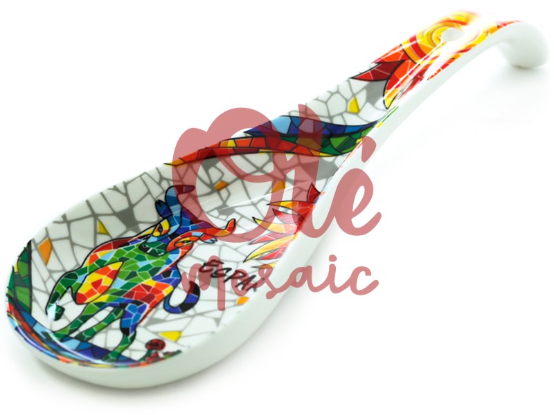 Concha de cerâmica decorada com um design vibrante de touros, que representa o folclore espanhol. A sua superfície branca está adornada com um colorido mosaico que ilustra um touro em tons de verde, vermelho e azul, complementado com detalhes em amarelo e laranja. Este utensílio, perfeito para a cozinha, combina funcionalidade e arte, e é um símbolo da tradição tauromáquica espanhola. Ideal como recordação ou para embelezar qualquer cozinha.