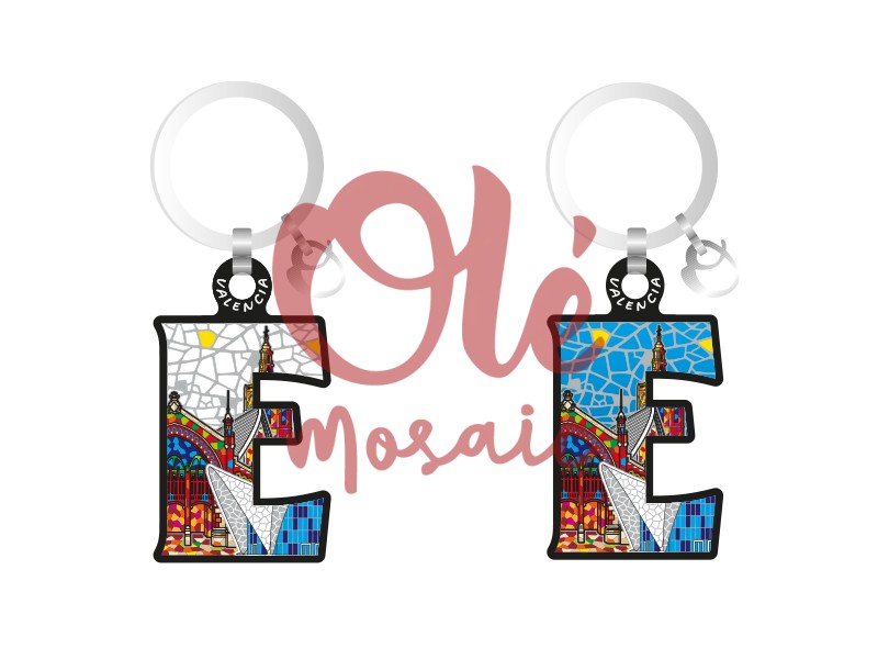 Llavero de madera con forma de la letra «E», representando la ciudad de Valencia. Este llamativo llavero presenta un diseño colorido, con un fondo de mosaico que ilustra elementos icónicos de la arquitectura valenciana, como la emblemática Ciudad de las Artes y las Ciencias. La base negra resalta los vibrantes colores azul, amarillo y rojo, proporcionando un toque moderno y artístico, ideal para recordar la esencia de Valencia en el día a día.
