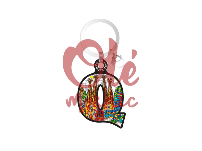 Llavero de madera con forma de la letra «Q», decorado con estructuras icónicas de Barcelona. Este atractivo llavero presenta un diseño vibrante diseño artesanal, pintado a mano, con elementos representativos de la arquitectura modernista de la ciudad, como torres y mosaicos coloridos. Con un acabado que resalta los colores rojo, azul y verde, es el souvenir perfecto para recordar la belleza de Barcelona, a la vez que añades un toque artístico a tus llaves.