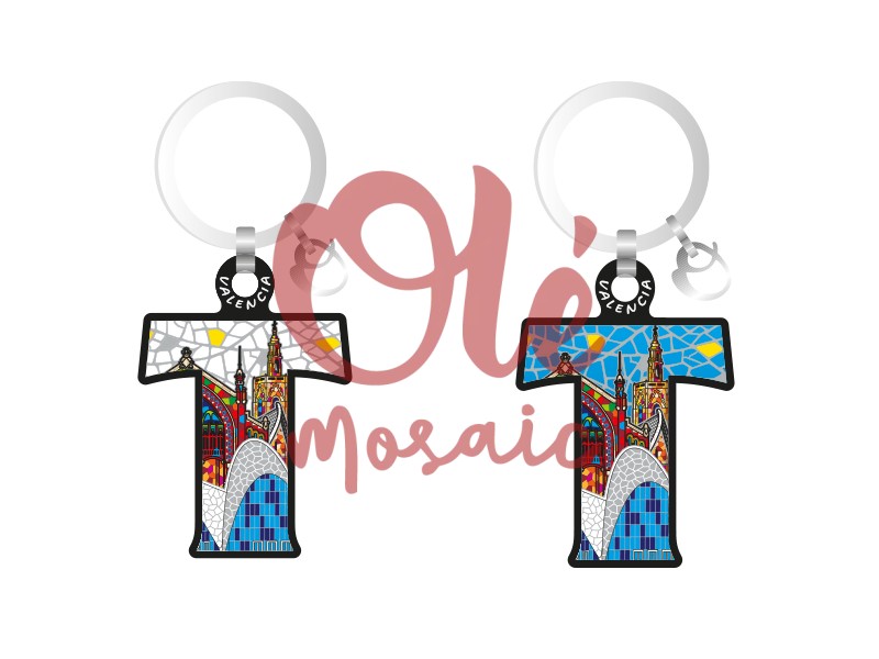 Llavero de madera con forma de la letra «T», inspirado en la ciudad de Valencia. Este llavero presenta un diseño atractivo con un acabado que imita el trencadís, característico de la arquitectura valenciana, mostrando elementos emblemáticos como la Ciudad de las Artes y las Ciencias. Decorado con los vibrantes colores azul, rojo y amarillo, este artículo es el souvenir perfecto para recordar la esencia y el arte de Valencia, a la vez que añade un toque moderno a tus llaves.