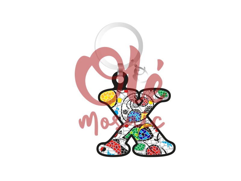 Llavero de madera con forma de la letra X, diseñado con un atractivo mosaico de colores. Este producto presenta un acabado detallado, con motivos de colores vibrantes en rojo, amarillo, azul y verde, que evocan el estilo artístico típico de las obras de Gaudí en Barcelona. La combinación de líneas negras y elementos decorativos le otorga un toque moderno y distintivo, perfecto para llevar contigo un pedacito de la creatividad catalana.